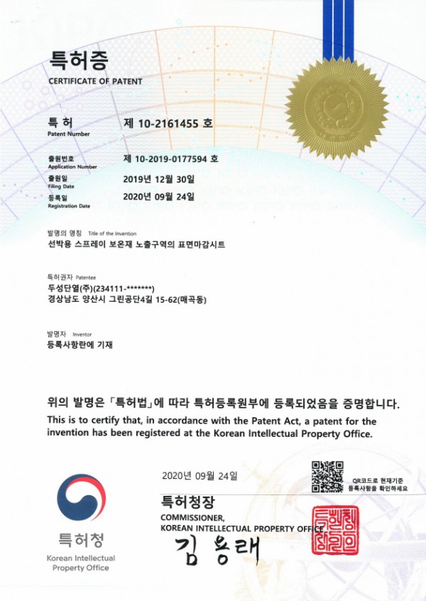 특허증 선박용 스프레이 보온재 노출구역의 표면마감시트 페이지 정보 작성자 최고관리자 댓글 0건 조회 1,489회 작성일 20-10-29 15:05 본문 선박용 스프레이 보온재 노출구역의 표면마감시트 검색 목록 다음글시공이 용이한 단열부 틈새 밀폐용 단열재 20.08.19 댓글목록 댓글목록 등록된 댓글이 없습니다.
