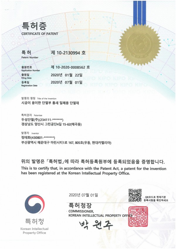 특허증 시공이 용이한 단열부 틈새 밀폐용 단열재 페이지 정보 작성자 두성단열 댓글 0건 조회 1,433회 작성일 20-08-19 10:49 본문 특허증-시공이 용이한 단열부 틈새 밀폐용 단열재 수정 삭제 검색 목록 이전글선박용 스프레이 보온재 노출구역의 표면마감시트 20.10.29 다음글신속하고 대량생산이 가능한 대형 엘보관용 단열재 제조장치 20.07.22 댓글목록 댓글목록 등록된 댓글이 없습니다.